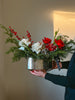 This refined seasonal arrangement blends classic romance with winter elegance. Featuring a striking mix of velvety red roses and creamy white roses, it is accented with bright red berries, natural pinecones, and lush evergreen foliage. The design is artfully styled with soft movement and layered textures, creating a full yet balanced composition.