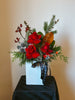 Bring a clean, modern touch to the holidays with this festive Christmas floral arrangement displayed in a crisp white square vase. Seasonal evergreens, vibrant red blooms, and winter textures create a rich, inviting look, while the sleek white container adds a fresh, contemporary feel. Perfect as a centerpiece, accent piece, or holiday gift, this arrangement blends classic Christmas charm with stylish simplicity—brightening any space with warmth, color, and seasonal elegance.
